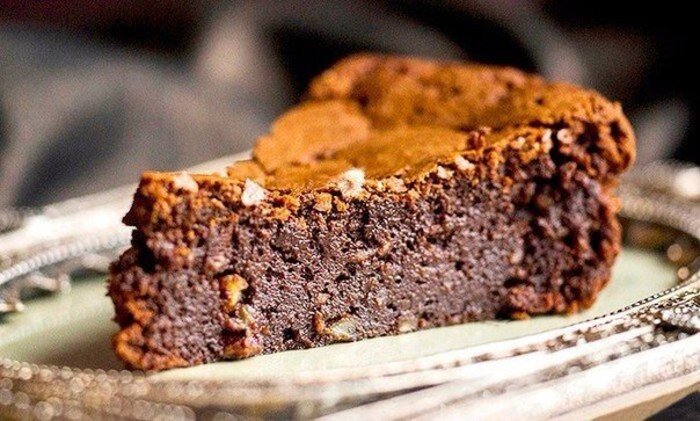 Трюфельно-шоколадный торт Ингредиенты: Сливочное масло — 150 г Сахар — 1,5 стакана Сметана (20% и выше) — 200 г Сливки (33-38%) — 250 мл Яйца куриные — 2 шт. Какао — 0,5 стакана Мука — 180 г Разрыхлитель — 1 ч. л. Сода — 1/4 ч. л. Шоколадный ганаш: Темный шоколад — 100 г Сливки (33–38%) — 80 мл Бренди (коньяк) — 2 ст. л. Посыпка: Тертый шоколад Миндальные хлопья Приготовление: Растопить масло в сотейнике. Добавить сахар, сметану, яйца, сливки. Перемешать без миксера до однородности. Добавить к муке соду, разрыхлитель, перемешать и подсыпать к смеси. Также перемешать до однородности. Добавить какао. Подготовить форму для выпекания. Выложить тесто и выпекать 45–50 минут в уже разогретой духовке при 170 °C. Остудить. Ганаш: сливки и поломанный шоколад поставить на огонь и прогреть при помешивании до растворения. Добавить бренди, перемешать и остудить до комнатной температуры. Перевернуть торт вверх дном и залить ганашом. Охладить и затем уже украсить по