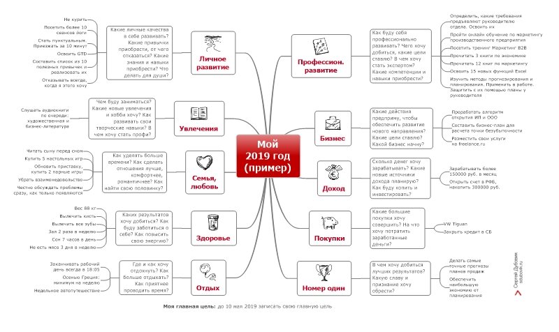 Миновало уже более 10% 2019 года. Последние 5 лет в конце года я делаю карту, которая должна помогать сформулировать, что вы хотите от себя любимого в этом году (и в последующих тоже). Карта 2019 года с рекомендациями по заполнению здесь: https://sdubovik.ru/materials/karta-celej-2019-goda/ В январе ко мне обратился руководитель отдела продаж компании-клиента. Молодой человек попросил немного помочь, говорил, что заполнение «…идёт со скрипом, или вообще не идёт. И хотя голова понимает, что надо закончить, рука не пишет.» Договорились о бартере. Я помогаю ему заполнить карту, он не возражает против её анонимной публикации. Помощь моя заключалась только в наводящих вопросах и требовании сформулировать свои хотения в виде осмысленных и измеримых вещей. Никаких рекомендаций не давал, желания и хотения не подсказывал. Вот что получилось в итоге: https://sdubovik.ru/thoughts/primer-karty-celej-na-god/ Самыми сложными были блоки про семью и про бизнес. Сформулировать что ты хочешь от с