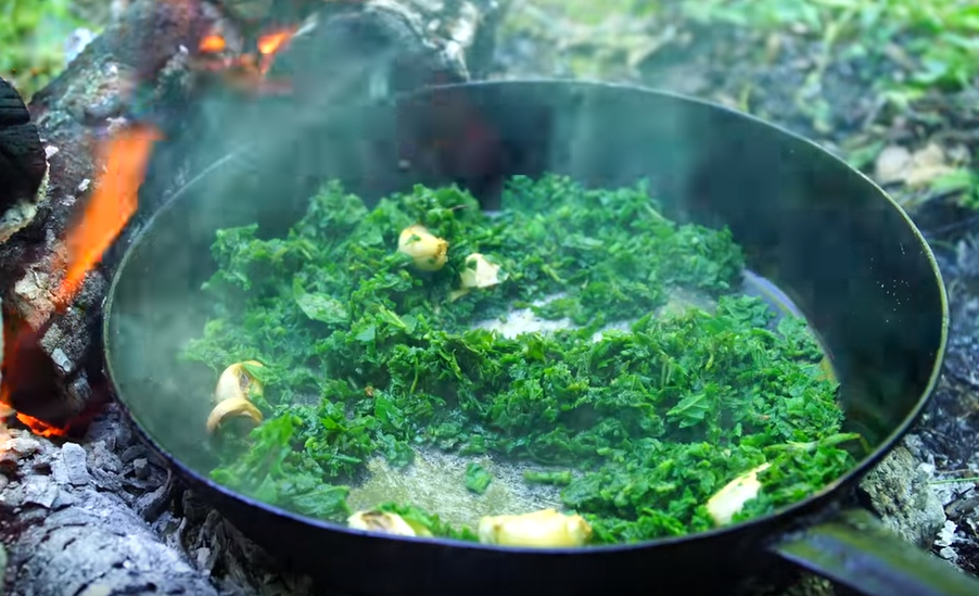Вбросить нарезанную зелень, перемешать и хорошо перемешать. Солить по вкусу. Добавьте несколько цветов одуванчика, поставьте на слабый огонь и медленно готовьте, пока мы готовим мясо. Стейк Кинг: