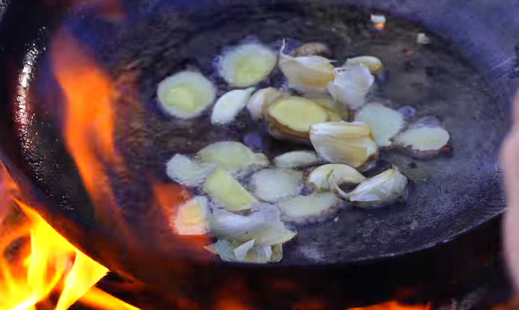 Бросить 1 ч. л. перца, 50 г нарезанного имбиря, 2-3 зубчика чеснока и 2 палочки розмарина. Отрежьте и удалите позвоночник из курицы. Хорошо натрите птицу солью.