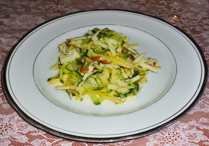Салат, рецепт которого представлен ниже, будет идеален во время поста. Но в этом случае сметану, которую я использую в качестве заправки, заменяем на масло. Время приготовления – 10 минут. Количество порций – 1. Ингредиенты Чтобы приготовить задуманное, возьмем: · репа – 70 г; · яблоко – 80 г; · огурец – 90 г; · сметана – 1 ст.л.; · зелень – по вкусу. Также дополнить салат можно семенами кунжута. Он добавит новые вкусовые нотки в блюдо. Способ приготовления Готовим салат: 1. Начиная процесс, я намеревалась использовать измельчитель, подаренный родителями супруга на Новый год. Измельчив огурцы, поняла, что дело не стоит свеч. 2. Поэтому далее я нарезала все ножом в форме соломки. Репу я использовала в этот раз желтую. Она имеет приятные сладкие нотки. 3. Нарезаем также соломкой яблоко. 4. Соединяем компоненты, добавив при этом рубленую зелень. 5. Заправляем сметаной или маслом. Солим. Салат готов. Так просто и быстро мы получили очень полезный и вкусный салат. А еще попробуйте приготов