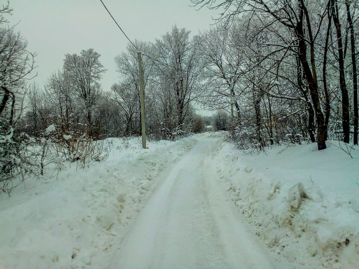 Зима - не самое удачное время для походов. Вокруг все голо, снежно и морозно. Да и достопримечательности с природой на фоне заснеженных окрестностей выглядят не так красиво. Другое дело - летом или весной. Но все же, охота, как говорится, пуще неволи, и будучи в гостях у родственников в селе, я все же решил совершить небольшой поход и отправился к местной достопримечательности - подвесному мосту через реку Дон. Мост этот находится между селами Волотово и Черепянь, и является довольно интересным местом в Липецкой области. Он во всей нашей области единственный, больше таких мостов у нас нет. И вот, я вышел из дома и потопал по расчищенной от снега дороге. Накануне был довольно обильный снегопад, и расчищенная дорога углублялась вниз. Глядя на дорогу, можно увидеть, сколько в этом году нападало снега. Сантиметров 60 - точно. Если даже не больше. Лазить по такому глубокому снегу - удовольствие сомнительное. А вот снег на ветках деревьев - выглядит очень даже красиво. Я дошел до бани в сел