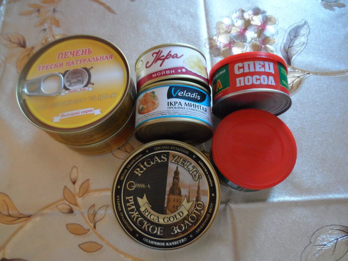 Печень трески 240гр - 600 рублей. Шпроты Рижское золото 160гр- 281 рубль Икра горбуши Спец посол 120гр- 862 рубля. Икра мойвы 50 - 187 рублей. Тушёнка свинная высший сорт 70ле - 262 рубля