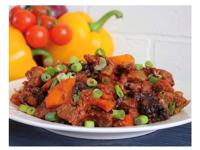 Говядину нарезать квадратиками 2×2 см. Чернослив замочить в горячей воде на 2-3 минуты. Лук и перец нарезать полукольцами, морковь кубиками. Говядину выложить на сковороду и потушить с добавлением воды в течении 7-10 минут. Добавить лук и морковь. Потушить еще 5 минут. Добавить чернослив, лавровый лист и томатную пасту. Тушить накрыв крышкой 25-30 минут на медленном огне.