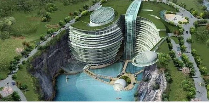 В пригороде Шанхая открылся необычный отель. Он расположен в заброшенном карьере глубиной 88 м. Удивительное здание со стальным фасадом прикреплено к скале. Объект прикреплён к скале. Только два этажа из 18 расположены выше уровня земли. Ещё два — под водой. Наземные этажи отданы под ресепшн, ресторан, зелёные зоны и конференц-залы, подземные — номера люкс, ресторан и 15-метровый аквариум. В отеле также имеются общественные места, бассейны, спорткомплекс и другая необходимая инфраструктура. В центральной части здания, представляющей собой стеклянный водопад, находятся лифты и смотровые площадки. Комплекс уже называют одним из самых зелёных отелей в мире. Конструкция постройки позволяет использовать солнечную энергию, а масса горных пород служит отличным теплоизолятором. Двухэтажная крыша с живыми растениями органично вписывается в окружающую среду. Здание спроектировано лондонским и шанхайским подразделениями студии Jade + QA. Строительство длилось 12 лет.