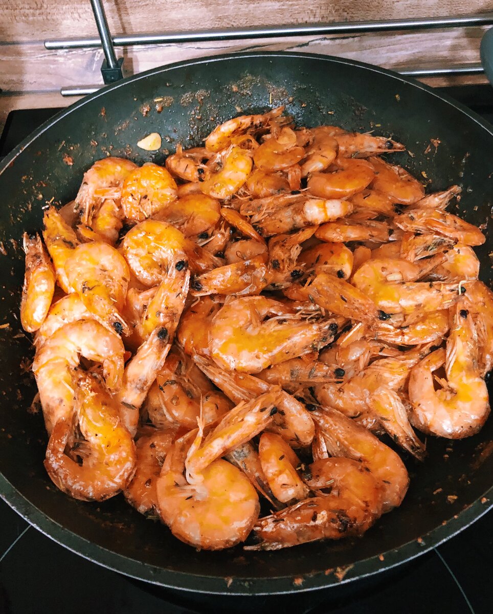 Ингредиенты: Королевские креветки - 1 кг Чеснок - 4 зубчика Соль - по вкусу Перец черный молотый - по вкусу Лимонный сок - половина лимона Сливочное масло - 30 гр⠀ Специи: паприка, орегано, тимьян, розмарин,тмин Соевый соус - 2 ст.л Приготовление: 1. Разморозьте креветки (можно сполоснуть их под чуть теплой водой — они так быстрее растают). 2. В большую тефлоновую сковородку положите сливочное масло. Подогрейте его на сильном огне и выложите креветки. 3. Огонь не убавлять (весь процесс готовки на сильном огне). Жарьте креветки без крышки периодически перемешивая деревянной лопаткой пока не выпариться вода (примерно минут 7–10). Тем временем нарежьте мелко чеснок. 4. Когда вода выпариться, а креветки слегка подрумянятся: посолить, поперчить по вкусу, добавить чеснок, соевый соус и все специи - накрыть крышкой. Минут через 5 перемешать, накрыть крышкой и готовить до желаемой корочки креветок (еще минуты 3). 5. Выключить огонь, дать постоять им еще минут 10 под крышкой. Сбрызнуть соком л
