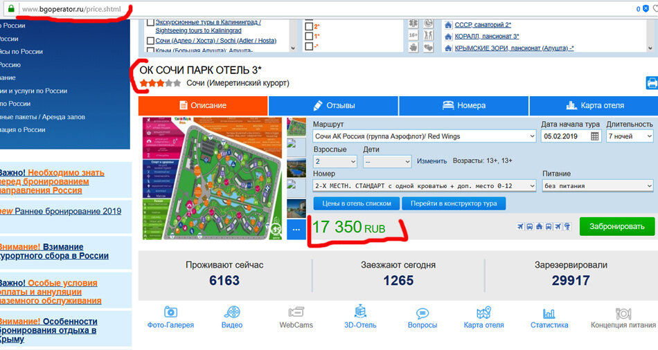 Собрались тут покатать недельку в Сочи, выбрали для отдыха Сочи Парк Отель - приводим ценообразование на тур с вылетом из Москвы на 2-х взрослых дабы наши поиски были полезны и другим туристам. Мы смотрели цену на сайте Библио-Глобус и на других крупных сайтах по туризму, выбрали те - где мы хотя бы раз бронировали тур и не было приключений с документами. Сначала зашли на сайт Библио-Глобус, там цена с перелетом с 05 февраля на неделю составила 17 350₽ Далее пошли искать на теже даты на сайт Слетать Ру тут цена - 16 651₽ Следующий на очереди был сайт Левел Тревел (к стати, мой любимый) тут цена - 16 651₽ Еще один ресурс, куда мы заглянули был сайт Травелата тут цена - 16 568₽ Последним на очереди был сайт ОнлайнТурс (по совету друзей) тут цена - 16 651₽ Как видите на ОнлайнТурс можно забронировать не только тур, но и номер отдельно, что не перестает радовать. ИТОГ - как видите, цена на отель разная, самый низкий ценник на сайте Травелата 16 568₽ и самый высокий на сайте Биб