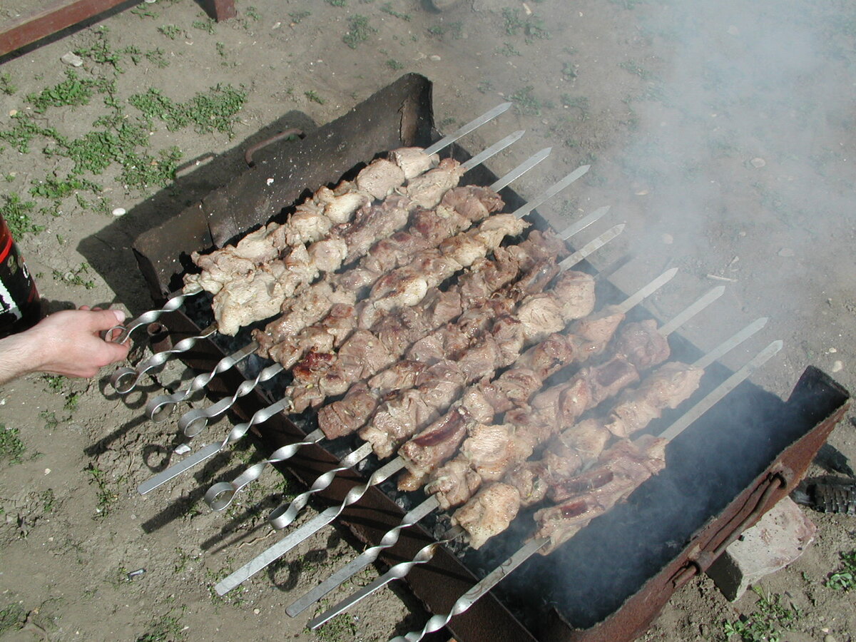 Настало время, товарищи, поговорить о святом - о шашлыках. Казалось бы, просто замаринованные куски мяса, нанизанные на шампуры и пожаренные на углях, что может быть проще и прозаичнее? Э, нет. Нет здесь ни прозы ни простоты, а есть искусство и философия. Философия шашлыков. Прежде всего мясо. Классика - баранина, но ту баранину надо уметь приготовить, чтобы она была сочной и мягкой, чтобы таяла во рту. Сейчас объясню, как всего этого добиться. Способ трудоемкий, предупреждаю. Так, с наскока сделать не получится, нужна длительная и тщательная подготовка. Прежде всего едете в Карачаево-Черкессию, в горы, где на свежей горной траве пасутся отары. Покупаете черного барашка. Это обязательно, смотрите не перепутайте! Дальше, уж как пожелаете. Или сами режьте или просите о помощи. Вот баран зарезан, мясо чуть-чуть остыло и нарезано на порционные куски. Посыпаем его солью и перцем, добавляем нарезанный полукольцами лук и оставляем на пару-тройку часиков. Потом дело техники - нанизать на ша