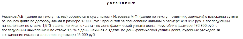 Как бы сильно мы не ругали нашу судебную систему, но часто именно суды помогают поставить на место недобросовестных займодавцев. Вот и сегодняшняя история об этом, как микрофинансовая организация хотела «срубить» с горе-должника приличную сумму в почти 1 000 000 рублей и это при изначальной сумме долга в 13 тысяч! Требования истца: 13 000 рублей - сумма займа 418 912 рублей - проценты 436 800 рублей - неустойка 15 000 рублей - судебные расходы Доводы суда: Проще говоря, суд считает, что если ваш договор микрозайма заключен на срок 17 дней, то и проценты на условиях МФО (то есть 1.9% в день) вы должны платить только за эти 17 дней. Начиная с 18 дня, проценты начинают капать по нормальной кредитной ставке (15%-19 % годовых). Таким образом, суд удовлетворил иск частично с суммой требований в размере 37 200 рублей. Согласитесь, достаточно справедливо с учетом того, что ответчик не платил целых 5 лет. Решение суда: Подпишитесь на мою группу ВК, чтобы получать еще больше полезной информаци