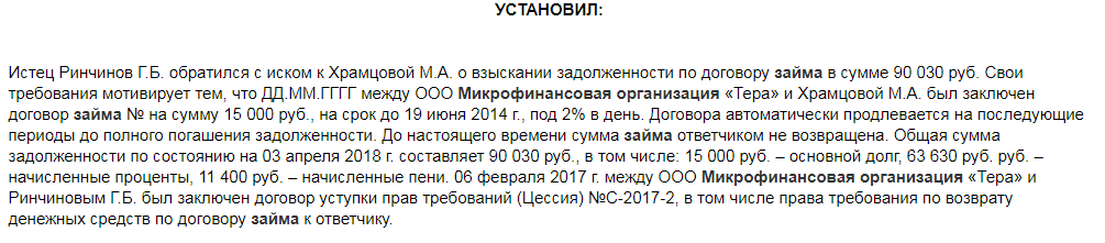 Все мы знаем о том, какие огромные проценты предлагают нам микрофинансовые организации, но мало кто знает, как в суде можно защитить свои права и законно отказаться выплачивать бешенные проценты на кабальных условиях МФО (к слову, этот способ подходит не только для микрозаймов). Давайте рассмотрим на примере: Дано: Бурятия. Летом 2014 года в МФО ответчик взял займ в размере 15 000 рублей и не возвращал долг в течение 4 лет. МФО передала право требования другому лицу, который и являлся истцом по делу. Истец требует вместо 15 000 рублей уже все 90 000. Что делает суд: Суд решает, что проценты, установленные договором займа между МФО и должником, могут быть сверхвысокими только в период действия договора! Проще говоря, вы берете займ в МФО в размере 15 000 рублей на 5 дней на условиях 1% в день. За эти 5 дней вы должны выплатить МФО сумму долга + 5%. Однако, если вы этого не делаете в установленный срок, то начиная с 6 дня, ваш договор считается неисполненным и его процентные условия
