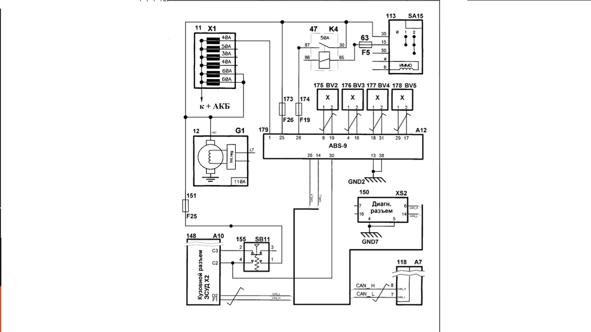 11 – блок предохранителей основной; 12 – генератор; 47 – дополнительное реле; 63 – предохранитель 7,5 А (F5); 113 – выключатель зажигания; 118 – комбинация приборов; 148 – контроллер ЭСУД; 150 – колодка диагностики; 151 – предохранитель 10 А (F25); 155 – выключатель сигнала торможения; 173 – предохранитель 25 А (F26); 174 – предохранитель 10 А (F19); 175 – ДСК переднего левого; 176 – ДСК переднего правого; 177 – ДСК заднего левого; 178 – ДСК заднего правого; 179 – ЭБУ ГА АБС.