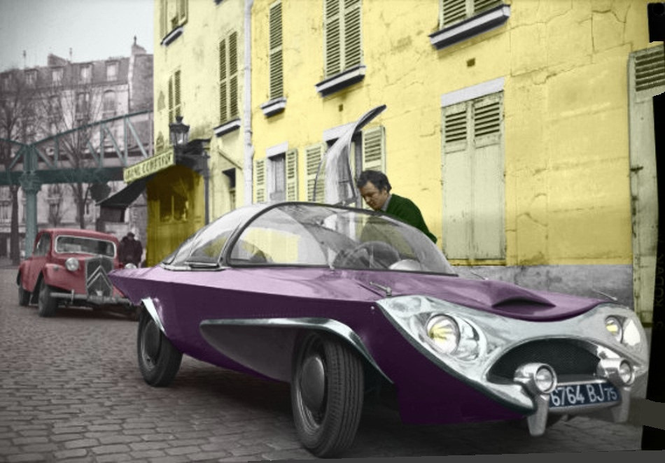Этот ретро-футуристический двухместный автомобиль был основан на базе Panhard Dyna X87 и построен двумя французскими промышленными дизайнерами: Jean-Pierre Dernat - скульптором и Serge Mouille - дизайнером перил и люстр. Мужчина на фотографии был владельцем машины: Пьер Потье. Автомобиль был изготовлен из легкого сплава алюминия и магния. Войти в машину можно было только через маленькие дверцы на крыше. Эта картина была сделана в парижском районе Сен-Жермен-де-Пре. До сих пор остается очень много вопросов по поводу истории этого автомобиля, которые остаются без ответа. От конструкторов осталось мало информации. А, как оказалось, Потье, сегодняшний владелец автомобиля, не имел значительную долю в создании дизайна автомобиля. Однако известной является история Dyna x87, на основе которой был построен концепт. Серия Dyna была блестящей и передовой линией ультра легких автомобилей с воздушным охлаждением двухцилиндровых оппозитных двигателей, приводящих в движение передние колеса. Вперв