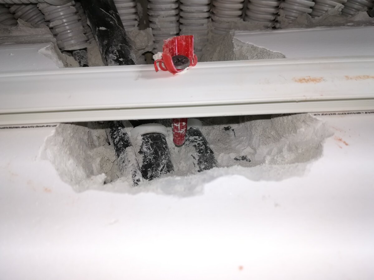 Всем известно, что специалист от специалиста отличаются и каждый работает по своему, как ему удобно или, как он умеет, о профессионализме здесь речь даже не идет. Профессионал перед вами или просто - шабашник (рукодельник) можно определить из разговора с ним, как он ведет себя, какие аргументы приводит для решения вашей задачи, что для него важно и как он решает те или иные вопросы. Один пример... Вызвали меня на объект, который я закончил не так давно в пос. Родной. Там "специалисты", что собирались делать потолки и меня Заказчик попросил "глянуть глазком" что там сделали, все ли нормально? На первом фото видно, что с потолка спускаются магистрали к щиту, как раз между двух распределительных коробок (см. фото в конце). По багету (к которому должны крепить полотно натяжного потолка) видны закрученные шурупы. На втором фото - спуск питающего кабеля на котельную (3 фазы) Ребятам чисто повезло, что слой штукатурки был толстый. Фото скрытых под штукатуркой магистралей. СОВЕТ ДНЯ: выбирая