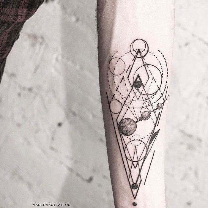 Космос с самых древних времен будоражил мысли человека своим величием и неизвестностью. Так что нет ничего удивительно в том, что многие хотят оставить его частичку у себя на теле. У меня в салоне очень часто делают как женские, так и мужские тату с созвездиями, космонавтами и планетами. Мой любимый микс - это четкие линии геометрии и дотворк! Поэтому, пожалуй, я начну с этой мужской тату на руке с планетами. Женская тату на ключице с космической кошачьей лапкой. А эта космическая татуировка на икре - отличная идея для женского браслета. Кстати, мужчины в основном делают тату с космосом именно в стилях графика и дотворк. Космонавты - не менее популярный сюжет для тату эскиза. Потрет Юрия Гагарина на плече - это по-настоящему космическая тату для мужчин. Немного папоротника и геометрии никогда не будет лишним! Если ты того же мнения, то эта черно-белая татуировка на предплечье тебя точно очарует. Ну и куда же без котов! Правильно - никуда. Котики космонавты хорошо смотрятся везде - и
