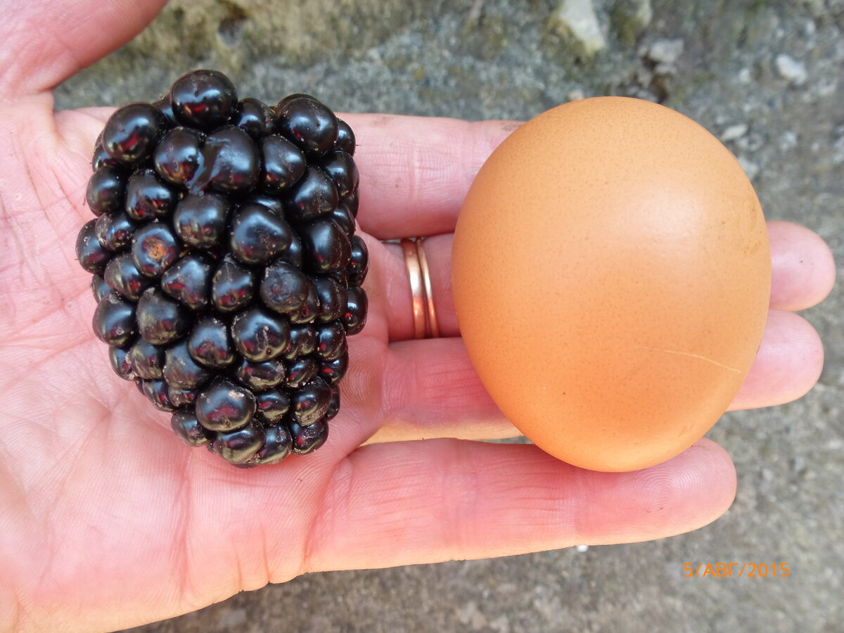 Да-да, ягоды ежевики с куриное яйцо! И дело совсем не в том, что мы ее как-то необычно кормим, дело в самом сорте! Сногсшибательный сорт, который поразит Вас , удивит соседей, и не оставит равнодушным НИКОГО! Когда я покупала маленький саженец сорта Киова, за немаленькую (признаюсь) цену , уже была наслышана о небывалом размере его ягоды, почему и не пожалела отдать энную сумму за такой экземпляр . Первые спелые ягоды были сняты 7 июня, куст цвел, на нем было много еще неспелых плодов и уже поспевшие первые ягоды. Размер действительно небывалый, огромные ягоды, такого размера мне еще не приходилось видеть никогда, хотя имея много культурных сортов, я уже спокойно относилась к крупному размеру ягоды ежевики. Производитель не обманул, заявленные качества сорта подтверждались. Я была на седьмом небе от счастья! Иметь такой сорт в своей коллекции – это гордость! В полной спелости сладкий с еле уловимой кислинкой, присутствует фруктовый оттенок. Ягода очень сочная, сок красящий темно-б