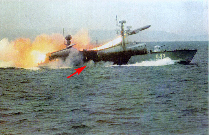 На снимке ракетный катер пр.205У производит пуск ракеты из левого кормового контейнера. И уже открыта передняя крышка правого кормового. Когда ракета стартует из него, то будет сожжена вся краска на носовом, но поскольку сверху него она ещё цела, а снизу сгорела, я уверенно могу сказать, что носовой уже отстрелялся.