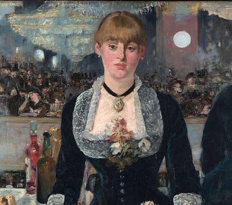 На картине «Бар в «Фоли-Бержер» Эдуард Мане фокусирует наш взгляд на барменше, которую размещает в центре полотна. Он попросил позировать для него Сюзон, одну из официанток. Чтобы понять на кого она смотрит с таким усталым и разочарованным видом, надо заметить отражение мужчины в зеркале за ее спиной. Слева можно заметить акробата - в «Фоли-Бержер» давали не только концерты и спектакли, но и цирковые представления.