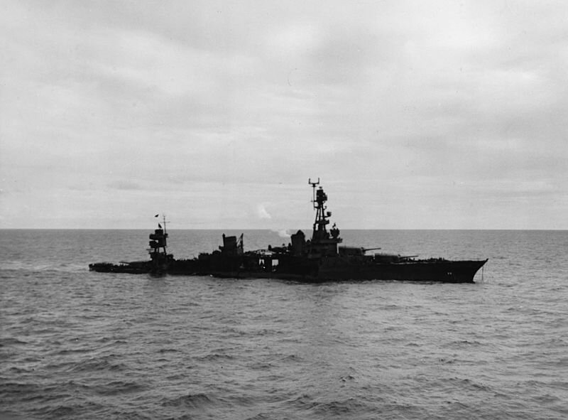 Крейсер потерял ход. Но американцы, как это часто бывало в годы Второй Мировой войны, показали, что они раздолбаи ровно до того момента, когда начинается борьба за живучесть. Аварийные команды отработали замечательно и нарастание крена удалось остановить.