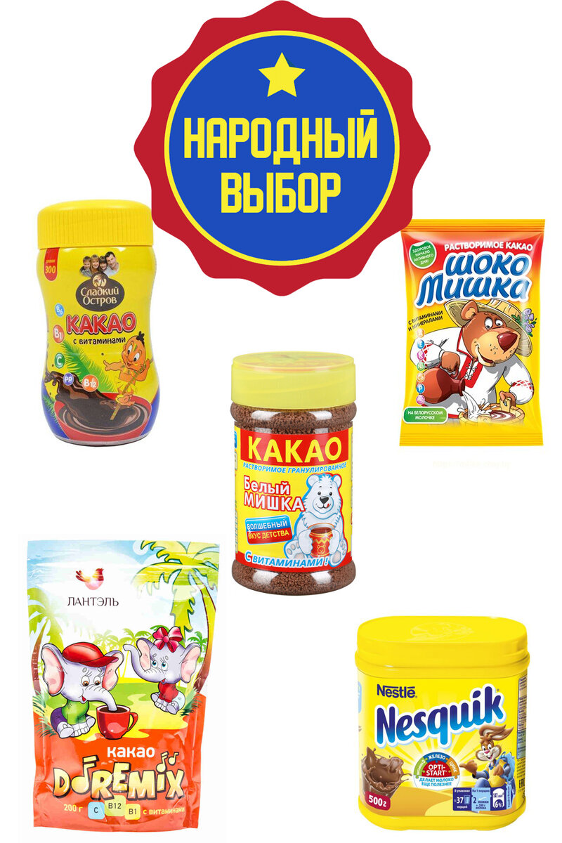 Этот напиток имеет не только необыкновенный потрясающий вкус, но и полезные свойства. В нем содержаться вещества, которые способны вас пробудить, мало кто знает, но какао-напитки пробуждают лучше, чем кофе. Также наш чудо напиток помогает при простуде и гриппе. Существует много различных торговых марок нашего напитка, но мы выберем, какой из них самый лучший. Сегодня примут участие такие торговые марки как: Сладкий остров, Белый мишка, Шокомишка, Nesquik, Doremix. Дегустируя данные напитки, мы выявили несколько критериев: растворимость, вкус, цвет, запах, текстура. Опираясь на них, фаворитом становится торговая марка Nesquik. Интересный факт. При покупке какао-порошка смотрите на состав, какао-порошок должен стоять на первом месте, чем меньше ингредиентов в составе, тем лучше. В идеале это какао, сухое молоко, сахар. Как выбрать победителя? Мы решили так, чем меньше пищевых добавок в составе какао-порошка, тем он наиболее натурален. На основании этого побеждает торговая марка Dor