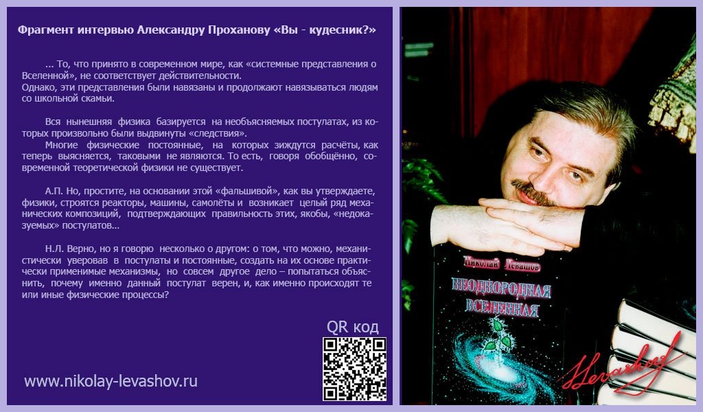 А.П. Но, простите, на основании этой «фальшивой», как вы утверждаете, физики, строятся реакторы, машины, самолёты и возникает целый ряд механических композиций, подтверждающих правильность этих, якобы, «недоказуемых» постулатов…