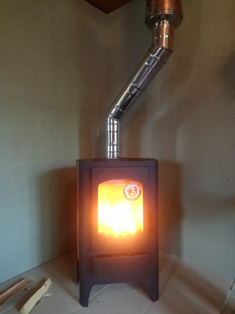 Отопительная печь-камин для садового домика. Печь-камин Бавария угловая Эко с плитой. Обогревает до 55 м2, имеет варочную поверхность, для приготовления пищи. Топка футерована шамотным кирпичом. Устанавливали в обычный садовый домик, размерами 6х6, со вторым этажом мансардного типа. Первым делом нужно, определится в каком месте будет стоять печь, это самый больной вопрос, потому что близко к стене печь ставить нельзя, а выдвигать ее к центру комнаты никто не хочет, так как она займет много места. Если ставить печь в том месте где Вы хотите, то тогда нужно потратится на дополнительные комплектующие к дымоходу, потому что дымовая труба попадет на потолочные балки (и это в 9 случаях из 10) Итак, определились с выбором места, печи и дымохода. 1-й этап Защищаем пол и стены от возгорания На полу стяжка и плитка, на стене огнеупорная плита Фламма Старайтесь прикрутить огнеупорную плиту по уровню, даже если стены кривые Между огнеупорной плитой и стеной, оставляйте вентиляционный зазор в 1см,