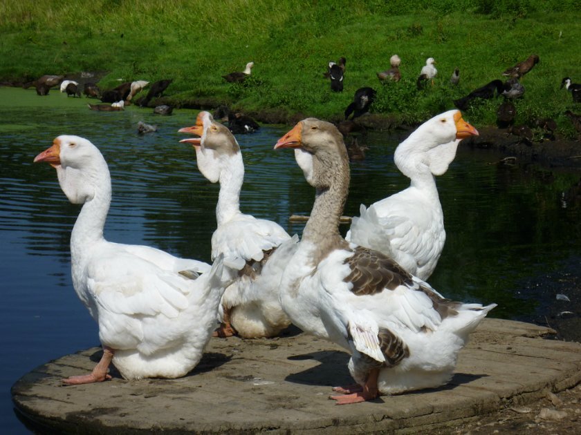 Гусиное стадо. От того, что птица собирается в стаю, способную себя защитить, для владельца много плюсов. Гусей можно приучить пастись самостоятельно, приучить их ходить на водоем. Это существенно снизит расходы на корм. Но, конечно, учитывать на дворе гусиный характер надо - гусей стоит держать на самом дворе в отдельном загоне, иначе остальная птица будет есть скромные остатки с гусиного стола, а молодняк уток и кур может быть забитым.