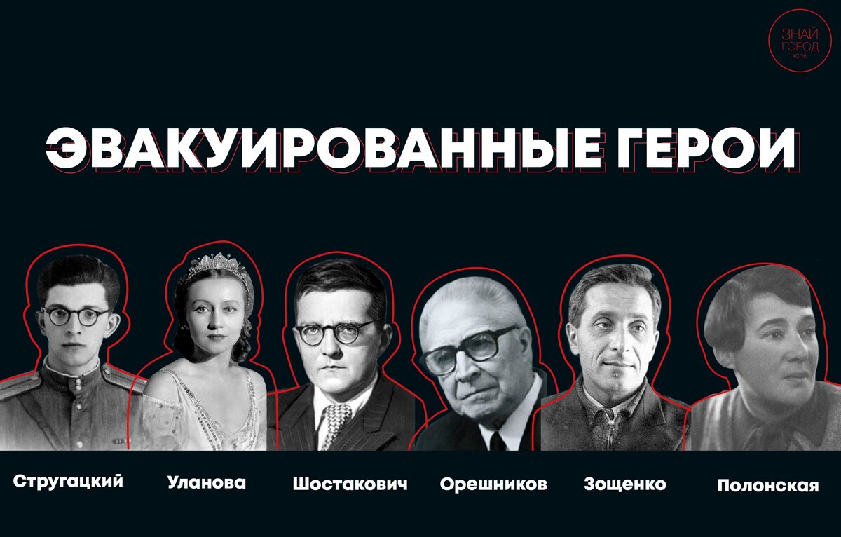 в Оренбургскую область 16-летний Аркадий Стругацкий вместе со своим отцом, когда как мать с больным Борисом оставалась в городе. До призыва в Красную Армию в 1943 году писатель-фантаст смог вывезти оставшуюся в городе часть семьи. Чуть постарше, в возрасте 31 год, балерина Галина Уланова была эвакуирована из блокадного Ленинграда в Алма-Ату. Там она выступала в труппе Казахского государственного академического театра оперы и балета. А в 1943 году получила почётное звание «Народного артиста Казахской ССР». Также, из города эвакуировали 35-летнего композито