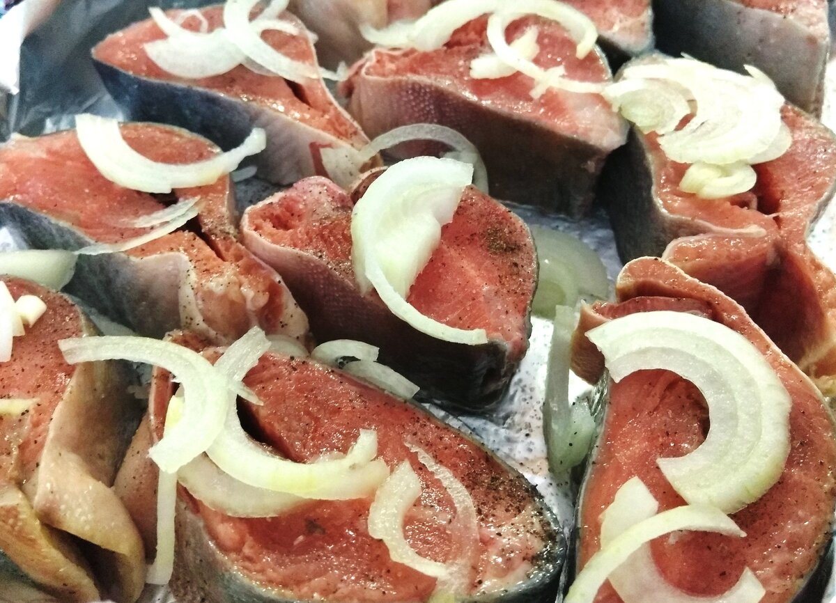 В первый раз я ее сделала в фольге: нарезала на порционные куски и приправила лимонным соком со специями. Получилось вкусно, но не сочно. Мне даже показалось, что тот сок, что был в рыбе, и тот куда-то испарился и кусочки стали как-то меньше по размеру.