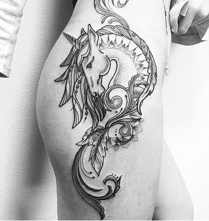 Мифические существа – популярный сюжет для татуировок во всем мире. Русалки, драконы, феи, эльфы, демоны украшают спины, ноги, плечи, запястья, шеи и мужчин, и женщин. В этом же ряду – единороги. Необычный конь пришел к нам из древних легенд. Самые ранние его изображения были найдены в Индии, этим рисункам более четырех тысяч лет. Единорог встречался в мифах Западной Азии, древних Греции и Рима. В целом же его образ можно найти в культуре разных стран мира. Традиционно единорог изображается как конь с рогом на лбу. У него белое туловище и глаза синего цвета. Именно в таком виде единороги чаще всего изображаются и на тату. Менее известны другие варианты внешнего вида мифического создания. Например, персидский единорог – это белый трехногий осел с шестью глазами и девятью ртами, а рог у него золотого цвета. Возникновение образа также связано с Индией и ее мифологией. В частности, в «Атхарваведе» сказано, что во время потопа Ману привязывал свое судно к рогу этого животного. Впрочем, в