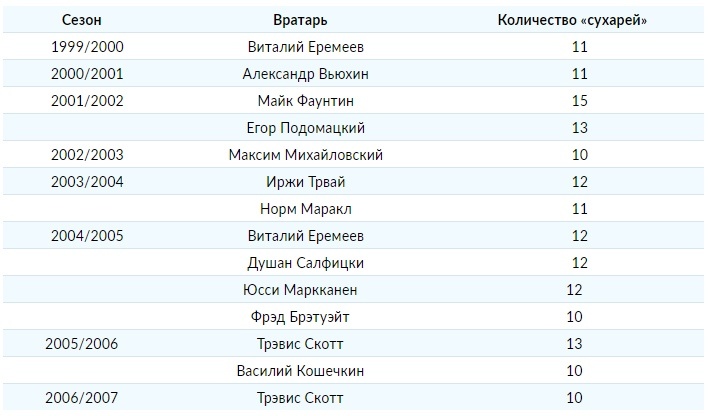 На «Арене 2000» 27 января в матче «Локомотив» - ХК «Сочи» 20-летний голкипер ярославского клуба Илья Коновалов в 10-й раз сохранил свои ворота от нежелательно забитых шайб и тем самым вышел в лидеры КХЛ по этому показателю. Итак, Илья Коновалов первым из голкиперов сыграл в этом сезоне 10 матчей на ноль. В чемпионатах России до создания КХЛ зафиксировано 16 таких случаев. Трэвис Скотт, Виталий Еремеев и Егор Подомацкий сделали это по 2 раза. В сезоне 1996/1997 гг. по 10 «сухих» матчей записали на свой счёт Подомацкий и Сергей Николаев. А вот полный расклад. Лишь один вратарь представлен как в списке рекордсменов по количеству «сухаре» до образования КХЛ и после создания Лиги. Это Василий Кошечкин. Напомним, что выше речь идёт о показателях за весь сезон, то есть, включая регулярный чемпионат, и плей-офф. Только в регулярных чемпионатах за всю историю чемпионатов России до 10 «сухарей» добирались следующие голкиперы: Таким образом, «сухая десятка» Коновалова стала девятым случае