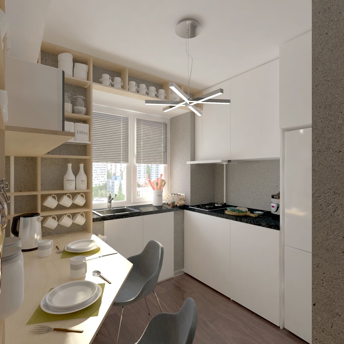 Основа - кухня в кирпичном пятиэтажном доме размером 1,92 х 2,58 м. Чтобы разместить всё необходимое обязательным условием стало использование широкого подоконника и зимнего холодильника под ним. В целях экономии были подобраны самые недорогие отделочные материалы - фанера, белое ламинированное ДСП, штукатурка серого цвета "под бетон", плитка под дерево на пол. Все бытовые приборы уже были и задача стояла разместить именно их. Вдоль короткой стены, за белыми фасадами разместились обычная стиральная машина с варочной поверхностью над ней и посудомойка. Холодильник оставили открытым. Над варочной поверхностью установили шкаф с вытяжкой и полочками. Рядом шкаф с сушилкой для посуды. Над холодильником глубокий шкаф для длительного хранения редко используемых вещей. Мойка разместилась на подоконнике. Под мойкой можно было установить встраиваемый духовой шкаф, но у хозяйки уже была куплена настольная мини-печь. Микроволновка и мини-печь разместились над обеденным столом на комфортной высо