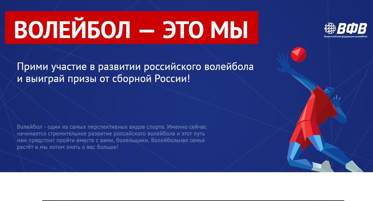 Всероссийская федерация волейбола проводит опрос на тему волейбола. Среди тех, кто заполнит анкету, ВФВ разыграет игровые мячи с автографами волейболистов сборной России, а также главный приз - игровую футболку сборной России