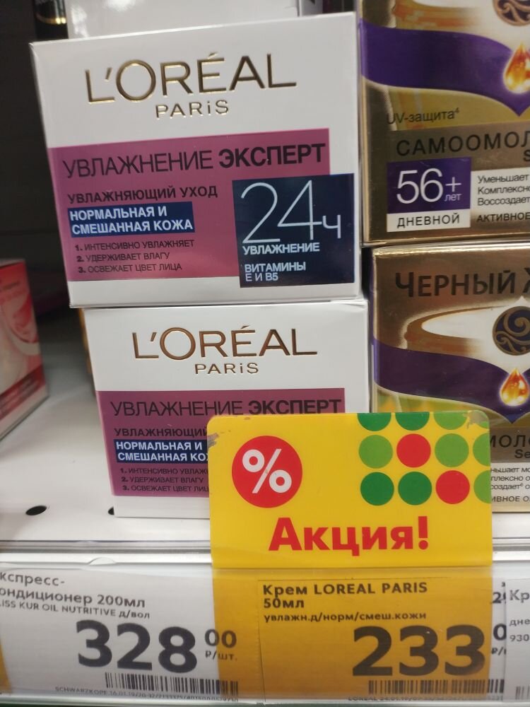 Многие из нас покупают декоративную и уходовую косметику и прочие товары для красоты в "Летуале", "Рив Гоше", "Иль де боте" и прочих магазинах, которые специализируются на таких штуках. Кто-то еще доходит до "Магнит косметик". Но на самом-то деле такие повседневные штуки можно купить и в обычном магазине у дома. Выбирайте любой сетевой, который у вас в шаговой доступности – и вперед. Напоминаю, что наиболее приятны для нашего кошелька покупки со скидкой. Правда, тут есть такой нюанс: какая-то вещь может быть в акционном каталоге магазина, а по факту в супермаркете вы ее не найдете. Решила показать вам, какие товары можно купить в рамках акции в "Пятерочке" сейчас. Итак, место действия – магазин в московском спальном районе Орехово-Борисово. Обычный визит после работы (часов в 8 вечера). Крем для лица L'Oreal, 233 рубля Увлажняющий крем для нормальной и смешанной кожи. На полке в магазине стоит недалеко от своих более бюджетных братьев из "Черного жемчуга" и "Чистой линии". Но со скидко