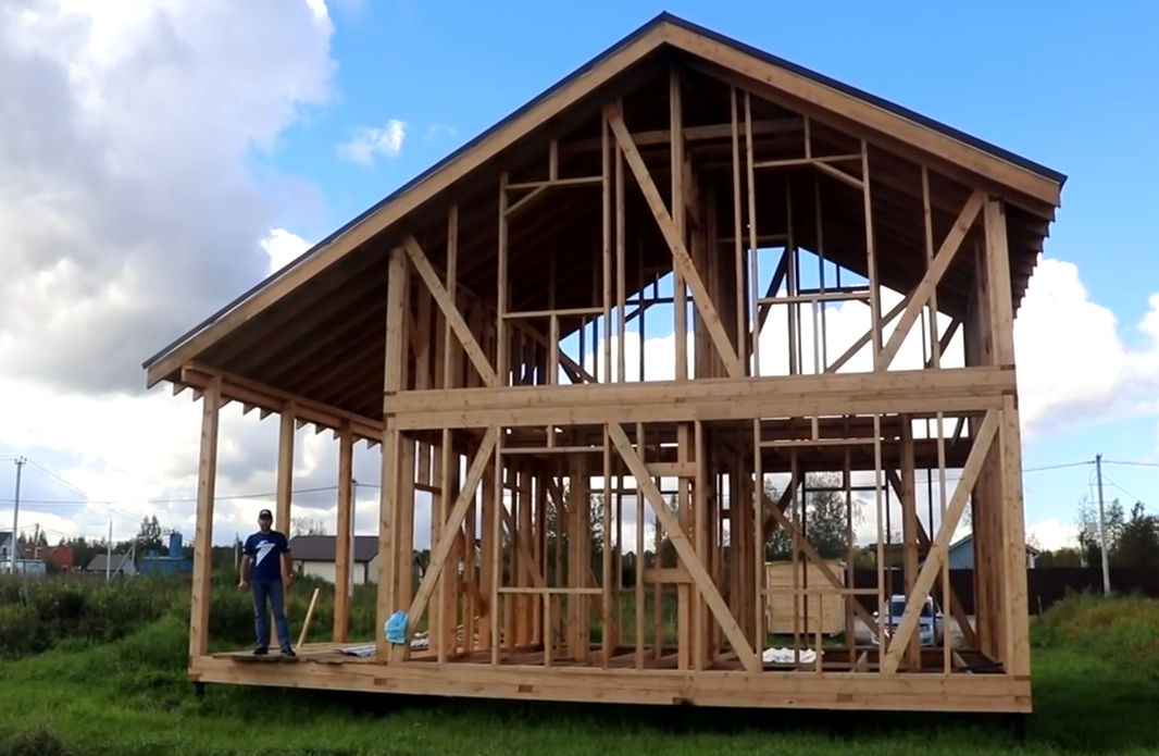 Представляем вашему вниманию домокоплект каркасного дома. Это небольшой дачный домик размером 6х7 метров и пристроенная к нему под общей крышей небольшая терраса шириной в 2.5 метра и длинной 6 метров, также, как и наш дом. Второй этаж мансардный. Домик летний, дачный. Толщина стен у него 150 мм соответственно и утепление в дальнейшем будет 150 мм, если заказчик изъявит желание, чтоб дом был у него был зимней для постоянного проживания, возможно установить дополнительное перекрёстное утепление в 50 мм, толщина стен таким образом, и соответственно толщина утепления, будет составлять 200 мм, и дом будет пригоден для круглогодичного проживания. Каркасный дом построен на свайно-винтовом фундаменте, который смонтировала наша бригада. Здесь применены винтовые сваи, диаметром 108 мм, 2.5 метра длинной в количестве 18 шт. это более чем достаточно для каркасного сооружения такого типа. Обвязка винтовых свай произведена брусом, сечение которого составляет 150х150 мм обвязка произведена путе