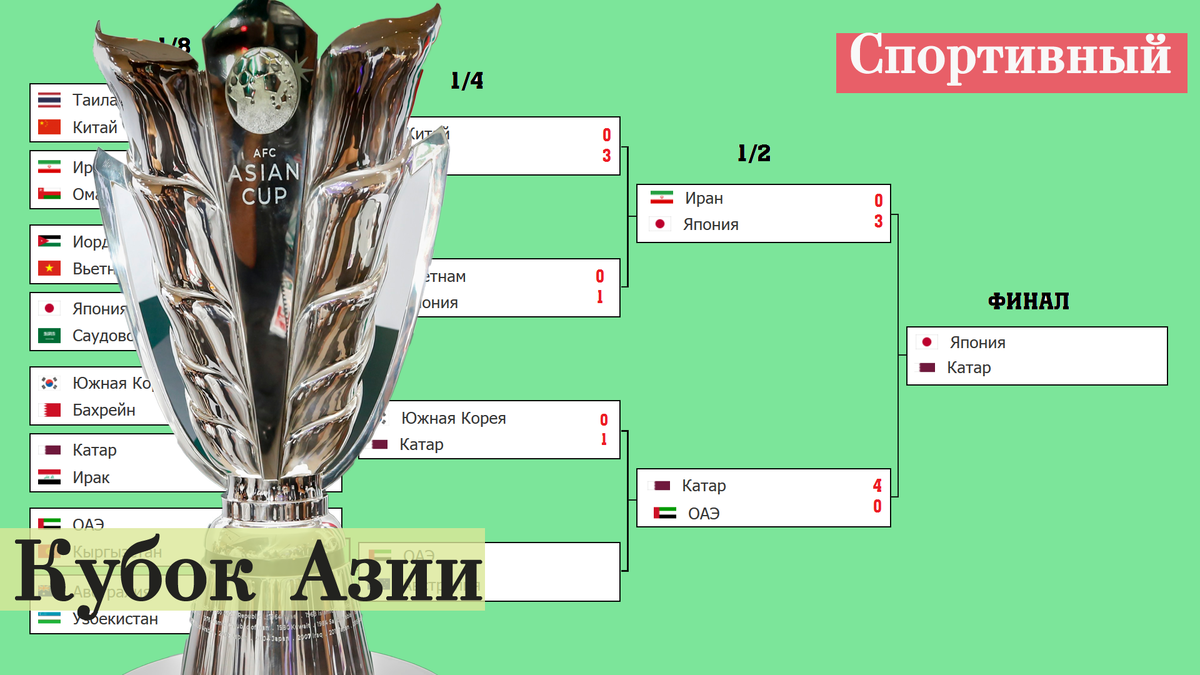Здравствуйте, уважаемые любители футбола. После этого финального выпуска Кубок Азии на «спортивном» не заканчивается, выйдет ещё два мега выпуска. В главной игре турнира сошлись сборная Японии, финал для них стал 5-м в истории, играть они сами с собой не могут, второй стала сборная Катара - это их первый в истории в финал. Мы вспомним путь победителей. Он довольно любопытен. То, что Япония выиграет все 3 матча в группе - можно было предугадать, у них 9 очков. 6 забито и 3 пропущенных мячей. А вот, то, что сделал в своей группе Катар – это катарская весна. 10 голов забито, 0 пропущено. 3 победы из трех возможных и 9 очков в подарок. Посмотрите, как похожи обе группы. И шейхи и самураи вышли с 1-го места, завоевав по 9 очков. Вторые команды взяли по 6 очков. И так далее. Группы – близнецы. В одной группе, правда, забито 20 и пропущено 20, во второй забит 21 гол и пропущен 21 гол. Как вы считает, у кого группа была слабее? Дальше Японии в 1/8 финала достался сильный соперник Саудовс