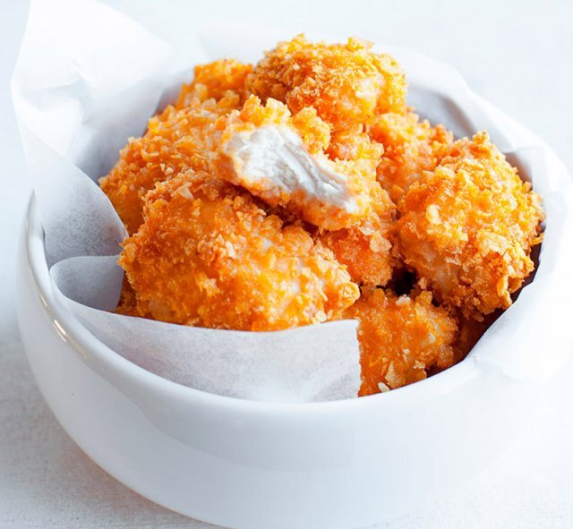 Растительное или сливочное масло – 4 ст. ложки Приготовление наггетсов: Филе (500-600 гр.) нарезаю кусочками около 3-4 см, приправляю солью, перцем и перемешиваю. Кукурузные хлопья (2,5 ст.) пропускаю через мясорубку или толку в ступке пестиком. Готовлю кляр. В миске смешиваю в однородную массу: молоко (1 ст.) с мукой (1/2 ст.), яйцом (1 шт.), солью, перцем и паприкой (1,5 и 1/2 ч.л.). Филе выкладываю в кляр и перемешиваю. Духовку нагреваю до 200 градусов. Большой противень выкладываю бумагой для выпечки. Каждый куриный кусочек в кляре панирую в кукурузных измельчённых хлопьях и укладываю на противень. Посыпаю будущие наггетсы солью и сбрызгиваю (или смазываю ки
