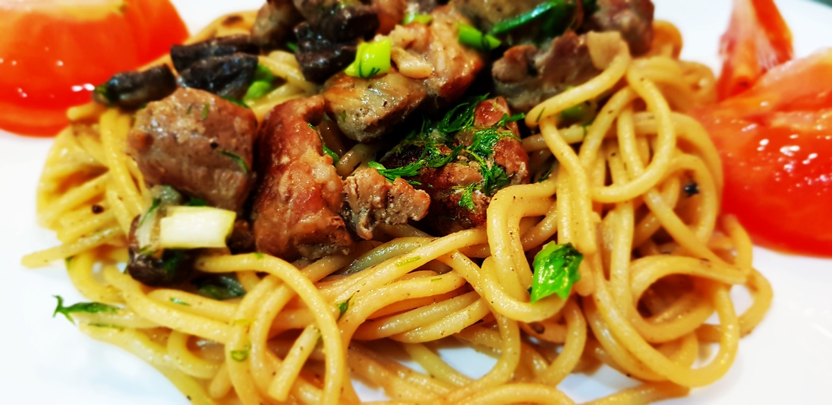 Итальянские исследователи доказали, что люди, которые едят много макарон, реже имеют избыточный вес. Частично это объясняется тем, что в средиземноморской кухне много свежих овощей и оливкового масла. Ингредиенты: 1. Свинина - 300 грамм. 2. Грибы шампиньоны - 300 грамм. 3. Спагетти из твердых сортов пшеницы - 250-300 грамм. 4. Лук - 2 шт. 5. Чеснок - 3 зубчика. 6. Сметана - 50 грамм. 7. Зеленый лук, укроп. 8. Соль, перец, приправа для мяса - по вкусу. Приготовление: Нарезаем мясо небольшими кубиками и отправляем жариться на сухой сковороде минут 7-8, регулярно перемешивая. Очищаем и нарезаем лук кубиками и отправляем к мясу. Жарим 3-5 минут. Далее идут грибочки. Убавляем огонь до минимального, накрываем крышкой, и томим в течение 5 минут. Затем добавляем чеснок и оставляем еще на 1 минуту. Добавляем сметану и 2 стакана воды. Тушим 10-15 минут. В конце добавляем специи. Пока томится будущая паста, отвариваем спагетти до полуготовности (al dente). Мы отдаем предпочтение макаронам из