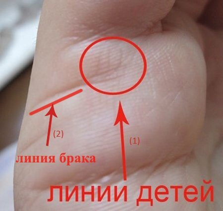 Сегодня я расскажу вам, как узнать, сколько у вас будет детей по вашей ладони. Количество детей определяют по вертикальным штрихам(1) у начала мизинца, которые идут от линии брака(2) на вашей ладони, что такое линия брака и сколько у вас будет браков, можете узнать в моей предыдущей статье. (См.рис.1) Рис.1 Считается, что штрихи отражают потенциальное количество детей. Поэтому у партнеров могут быть разные рисунки на ладонях. Обращать внимание следует на выраженные линии: Толстая черта указывает на рождение мальчика, тонкая – на рождение девочки. V-образная линия предвещает появление близнецов.(См.рис.2) Рис.2 Штрихи, расположенные близко к ребру ладони предвещают раннее появление детей. И наоборот, чем ближе к центру находятся линия, тем позднее у человека будет ребенок. Черточки, которые выходят из линии брака вверх, показывают детей, которые будут рождены в паре, узаконившей отношения. По одной из трактовок самая длинная черта указывает на любимого ребенка.(См.рис.3)