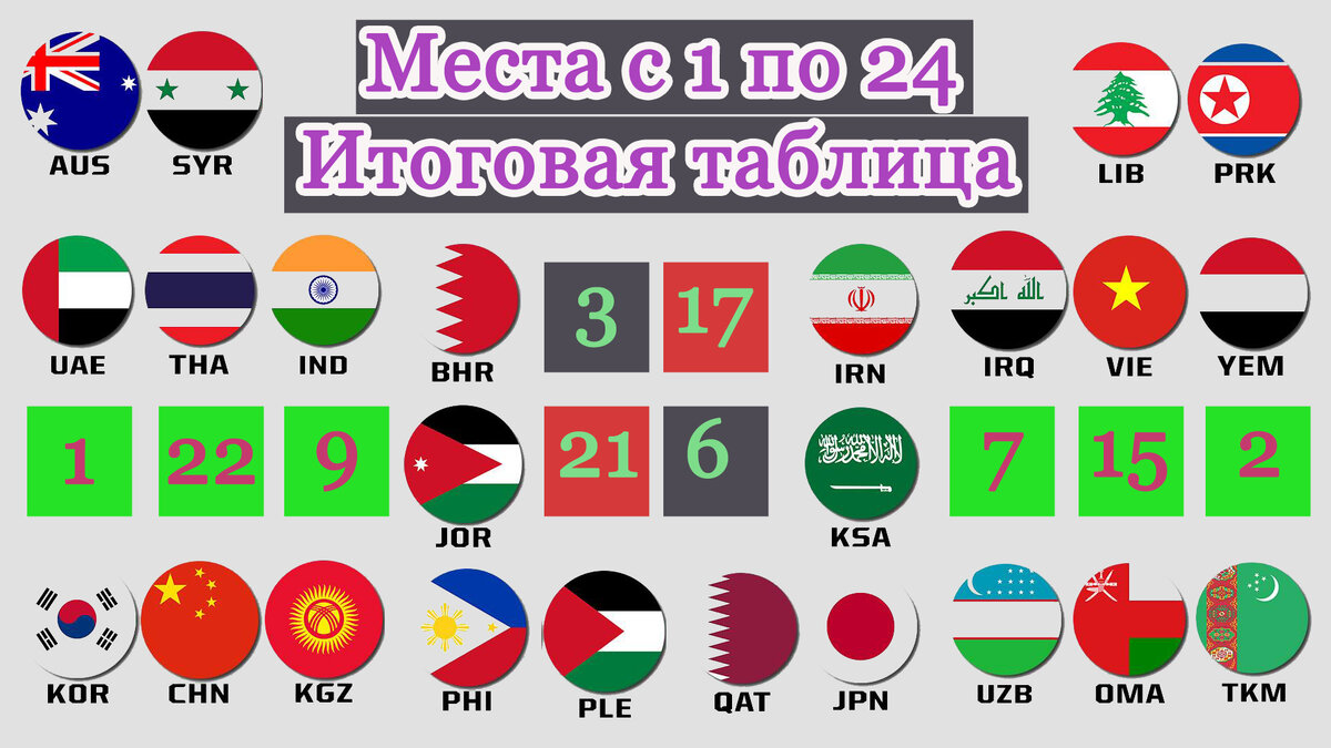 Здравствуйте, мы сейчас распределим все команды, которые участвовали на кубке Азии, по местам с 1 по 24, а я расскажу, как мы этого добьёмся.