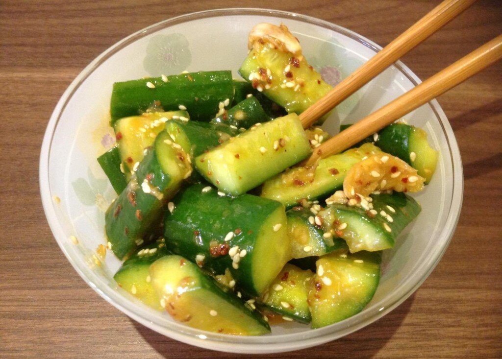 Кунжут (семена) - 1 столовая ложка Огурчики моем, отрезаем кончики. Огурцы нарезаем брусочками или кубиками размером примерно 2-3 см. Добавляем соль, перемешиваем и оставляем на 20 минут. По истечении этого времени, сливаем образовавшийся сок. Кладем соевый соус, перец и уксус. Теперь займемся семенами кунжута. На раскаленную сковороду с растительным маслом высыпаем кунжут и обжариваем до золотисто-коричневого цвета. Только смотрите не пережарьте! Кунжут очень быстро обжаривается. Кунжут вместе с горячим маслом добавляем к огурцам. Кунжут, если хотите, можно вообще не обжаривать, а положить прямо так. Но растительное мас