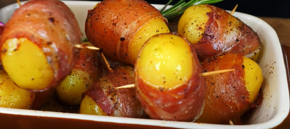 Отличный вариант для вкусного гарнира на праздник. Обычная картошка превращается во вкуснейшее блюдо. Ингредиенты: Мелкий картофель - 10 штук Бекон - 10 полосочек Соль, перец, чеснок, зелень Итальянские травы приправа - 1 чайная ложка Сливочное масло - 20 грамм Растительное масло - 20 миллилитров Зубочистки Йогурт классический - 40 грамм Сметана - 40 грамм Картошку отварить в подсоленой воде до полуготовности. На полоски бекона нанести сливочное масло тонким слоем. Закрепить бекон зубочисткой, проткнув картофель насквозь. Немного поперчить. В форму, смазанную растительным маслом выложить картошку. Форму укрыть фольгой. Готовить картофель при 170 градусов духовке - 20 минут. Приготовим вкусный соус. Смешать йогурт со сметаной. Добавить чеснок, пропущенный через пресс, прованские травы и зелень. Готовый картофель с беконом подавать с соусом. Приятного аппетита! Если понравилось превращение картофеля - обязательно ставьте лайк и подписывайтесь на мой канал. Заходите еще! *** Статья п