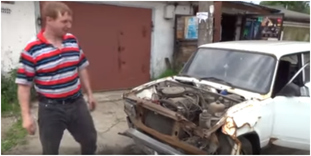 Сейчас я вам расскажу секрет как больше получить денег на металлоприёмке. Берём воронку и наливаем в бак воды. На сорок килограмм будет тяжелее. Сдали мы её за 5800 рублей, и осталось у нас только коробка, карбюратор, генератор, стартер, сиденья, торпеда…