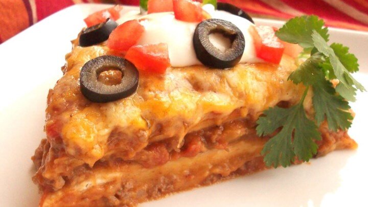 Это блюдо очень похоже на лазанью, только в мексиканском стиле! Подача удивит вас! Пирог из Мексики со сметаной, сальсой, салатом и помидорами. Получается очень острый рецепт. Все в стиле любителей жгучей пищи. Рецепт не является популярным, но может стать новым опытом для русского любителя запеканки и сытного ужина. Приготовьтесь потратить время на приготовление этого пирога. Время займет около часа. Но вы получите целый противень еды на всю семью. 16-18 порций должно получится, если следовать моему рецепту. Ингредиенты для приготовления: - 1 кг говяжьего фарша; - 1 лук, нарезанный; - 2 чайные ложки сушеного чеснока; - 50 грамм черных оливок; - 50-100 грамм чили перца; - 300 грамм соуса сальса; - 1 бака соуса для тако ; - 2 банки фасоли красной ; - 12 листов лаваша; - 250 грамм тертого сыра. Готовим блюдо в следующей последовательности: 1) Разогреваем духовку до 170 градусов. 2) В большой сковороде на среднем огне обжариваем фарш в течение 5 минут. Добавляем лук и чеснок и обжариваем