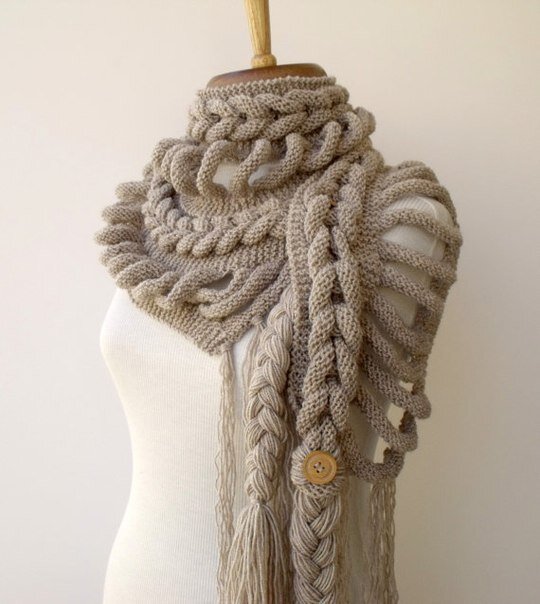 Привет всем! Давно еще на глаза попалось объявление. "Кто знает как связать такой шарф? Хочу такой." И фото под ним... С первого взгляда даже непонятно как вообще такое чудо связано. Была одна мысль - "Наверное, очень сложно!" Однако...Захотелось попробовать и оказалось, что все гениальное просто и вещь действительно получается интересная и не стандартная. Нитки я взяла какие у меня были в наличии в большем количестве (100 процентный хлопок). Ушло где-то 500 гр. Набираем 90 петель + 1 кромочная петля. Полотно вяжется платочной вязкой. Провязываем 7 рядов. 8 ряд: от края провязываем 10 петель, 30 петель закрываем, 10 провязываем, 30- закрываем и 10 - провязываем. 9 ряд: 10 петель - провязываем, набираем 30 воздушных петель на спицу, 10- провязываем и т.д. 10 - 17 ряды: вяжем чередуя изнаночные и лицевые ряды. Затем повторяем узоры (как с 8 ряда). Получается 3 дорожки платочной вязкой (по 10 петель), и 2 широкие дорожки (по 30 петель), вяжутся изнаночной вязкой. Я связала более