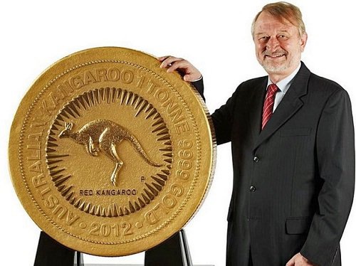 Осенью 2011года на смену рекордсменке 2007, которая была «родом» из Канады, весила 100кг и приравнивалась к $925500, пришла «красавица» из монетного двора Австралии. Новый денежный знак весом 1 тонна имеет диаметр около 80см при толщине 0,12 метра и считается самым дорогим в мире. Эд Харбуз – исполнительный директор Perth Mint (старейшего австралийского монетного двора) заявил, что новинка является вершиной изобретательности и новаторства, и изготовлена из золота чистотой 99,99%. Несмотря на то, что «драгоценная» несколько проигрывает канадской, создатели которой заявляли чистоту 99,999%, её победа в номинации «Самая большая» несомненна. Именитая предшественница имеет размеры большой пиццы и не может конкурировать с «австралийкой». Все существующие ранее проекты «денежных громил» оставались лишь арт-проектами. Последняя разработка имеет не только истинное воплощение, но и реальную ценность. Australian Geographic называет её 1 Tonne Gold Kangaroo Coin – монетой в 1000000 австралийских