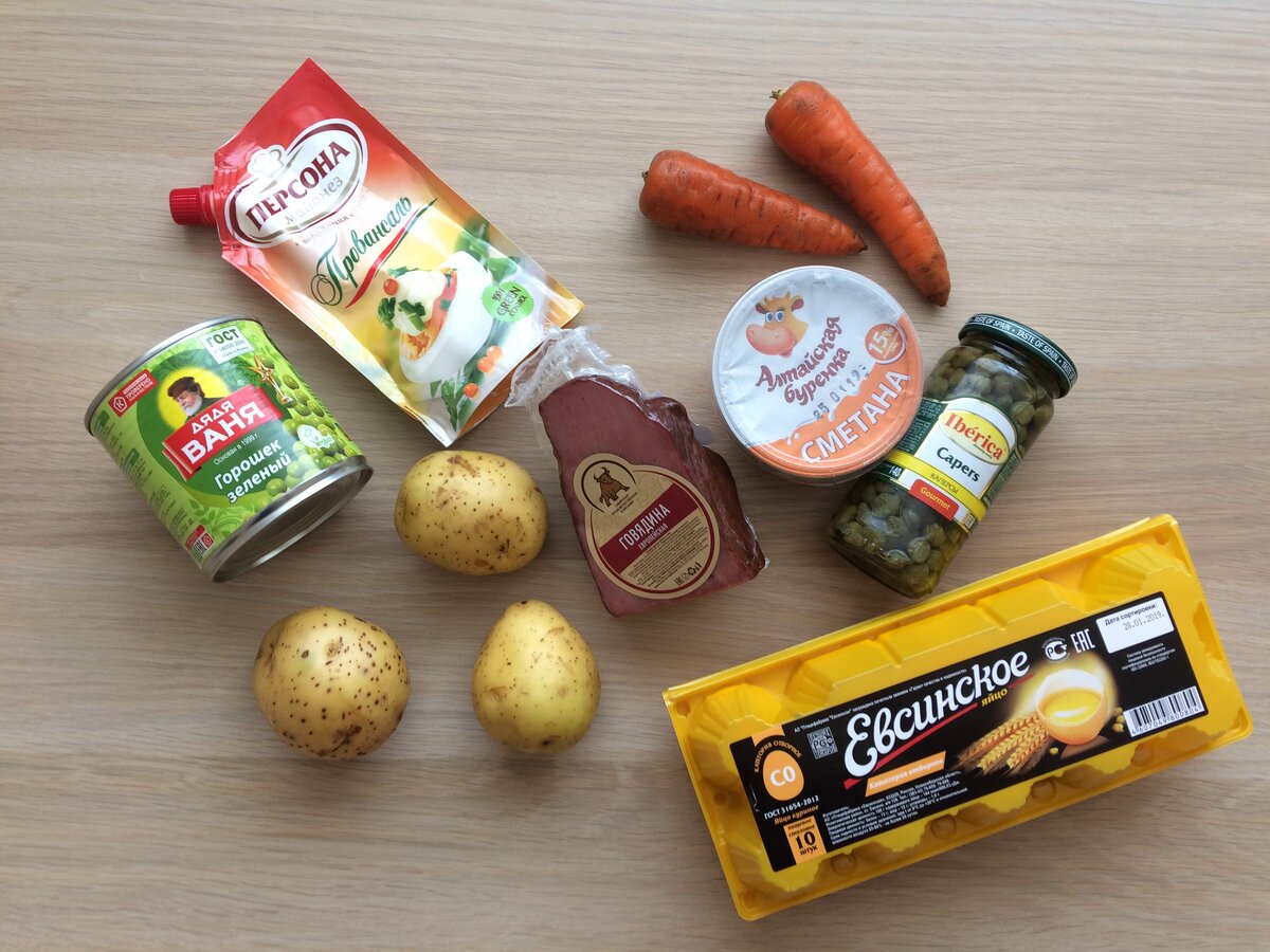 Оливье – настоящая классика для россиян. Для большинства это новогодний салат, но он вполне может входить в повседневное меню. Несмотря на любимый многими классический рецепт, нет ничего плохого в том, чтобы его модернизировать на свой вкус. Предлагаю вашему вниманию мой вариант. Список ингредиентов · Картофель; · Морковь; · Яйца; · Говядина; · Каперсы; · Майонез; · Сметана; · Соль; · Перец. Почему такие замены Как вы могли заметить, в этом рецепте Оливье на смену классической Докторской колбасе и соленым/маринованным огурцам пришли каперсы и говядина. Почему я выбрала такие замены? Мне уже давно не нравится большинство предлагаемых в магазинах колбас. Я элементарно сомневаюсь в их качестве (если у вас есть любимые сорта и производители, дайте знать в комментариях). Поэтому на смену ей беру копчено-вареную говядину. Марка здесь особого значения не имеет. Выбор отдаю продукту, который визуально выглядит привлекательно и не состоит из пленок и хрящей. Теперь о каперсах. Я люблю соленые о