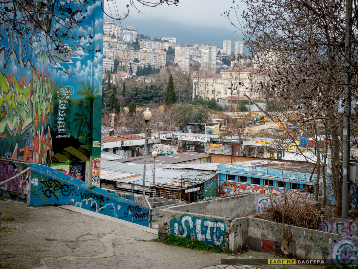 Если в любой поисковый портал вбить слово "Ялта", то в результатах поиска мы увидим десятки тысяч ярких, красивых, завораживающих фотографий потрясающих морских видов и горных пейзажей. Все это, конечно же, так и есть, однако, помимо парадного фасада есть еще и другая сторона города, скрытая от глаз туристов. Сегодня, хочу вам показать несколько фотографий, в которых вы вряд ли узнаете "жемчужину" Крыма. Давайте немного отклонимся от туристических маршрутов и пройдемся по обычным улочкам города. Ялтинский дом культуры Находится в самом центре города. Стоит свернуть направо с улицы Московская, и пройдя 100 метров мимо городского рынка, мы попадаем сюда. Слева от Дома Культуры зеленая изгородь рынка увешанная объявлениями. Шикарный вид. В этом месте очень много граффити. Смотрится, местами, весьма интересно, но как то больше напоминает декорации к фильму про постапокалиптическое будущее, нежели главный город-курорт полуострова Крым. Очень хочется надеяться, что со временем тут наведут