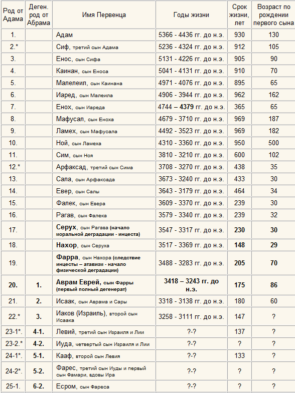Глава 1. О ГЕНЕТИКЕ, ЧЕЛОВЕЧЕСКОЙ ЛЮБВИ, И СКОТСТВЕ. Наследственные дефекты генетической матрицы человека произошли как от несоблюдения норм человеческой морали в жизни у остальных народов, так и от вмешательства "скотской крови" генетического эксперимента Сатаны над евреями. Понять это поможет анализ Библии, в первую очередь статистический. Почему Библии? Генетика как наука возникла сравнительно недавно - в начале прошлого века, т.е. всего 4-5 поколений людей тому назад. Накопить за это время материалы по изменению длительности жизни людей от поколения к поколению, чтобы понять закономерности и сформулировать законы генетики, было просто невозможно - нет статистической информации. Уповать на анализ «генеалогических древ» старинных родов Европы бессмысленно - в средние века, да и позже, мало кто умирал своей смертью - череда войн, эпидемий, убийств в борьбе за власть сделали свое дело. Статистическую информацию по людям брать было просто неоткуда. Поэтому законы генетики исследовались на растениях, имеющих годовой цикл развития, а позже на мушках-дрозофилах, имеющие всего двухнедельный цикл жизни поколения. Примечание. ДРОЗОФИЛЫ, род двукрылых насекомых семейства плодовых мушек. Длина до 3,5 мм. Около 1000 видов, распространены широко, более многочисленны в тропиках и субтропиках. Обыкновенная плодовая мушка — классический объект генетики (легко разводится в неволе, очень плодовита, обладает большой изменчивостью). Изучение наследования признаков у дрозофилы школой Т. Х. Моргана послужило экспериментальной основой хромосомной теории наследственности. А Библия в этом отношении уникальна - там дается анализ длительности жизни людей от Адама на протяжении 25 поколений. Тогда войн не было, и статистика Библии истинна. И хотя законы генетики по Библии не составлялись, можно "идти от обратного": зная законы генетики понять причинно-следственные связи и мотивы поведения ее персонажей, и на основе этого анализа сделать выводы. Составим таблицу и «генеалогическое древо» по материалам Библии и проанализируем статистику по поколениям ее персонажей. Их родословия с указанием времени жизни подробно описаны в «Ветхом завете» – от Адама до Финеса, внука Аарона, а в «Новом завете» дается генеалогическая линия от Абрама Еврея до Иисуса Христа, - правда, без времени жизни. За исходную дату таблицы принята по моим данным дата рождения Адама 5366г. до н.э.; по данным Библии эта дата будет – 5508 г. до н.э. И если в датировке больше доверяете Библии, чем мне, то даты легко можете пересчитать сами – по Библии они на 142 года раньше.