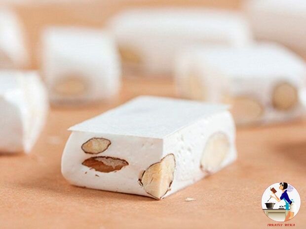 Sizning diqqatingizga lazzatli shirin desert uchun keyingi retseptni taqdim etamiz. Bu desert shirinliklarni hush ko'ruvchilar va ayniqsa bolalar uchun juda ham maqul bo'ladi. Bodomli nuga og'zingizda eriydigan va choy uchun eng yaxshi desertdir. Kerakli masalliqlar: 250 gramm bodom 100 gramm asal 400 gramm shakar 2 dona tuxum oqi 3 osh qoshiq jo'xori siropi Bir chimdim tuz 50 gramm saryog' 1 choy qoshiq vanilin kukuni Tayyorlash usuli: 1. Chuqur idishga tuz, shakar va jo'xori siropini jamlang. Shakar butunlay eriguncha aralashtiring. Past olovga qo'ying va yengil qaynaguncha kuting, doim aralashtirgan holda. Qaynagan vaqtdan boshlab 10 daqiqa qaynating. Sirop darajasi 150 darajada bo'lishi kerak. Haroratni maxsus gradusnikda o'lchang. 2. Aloxida idishda tuxum oqlarini oppoq, yengil ko'pik holiga kelgunga qadar ko'pirtiring. Ilitilgan asalni nozik oqimda tuxum oqiga qo'shing, ko'pirtirishni davom etgan holda. 3. So'ng, ko'pirtirishni to'xtatmagan holda nozik oqimda, tayyorlangan s