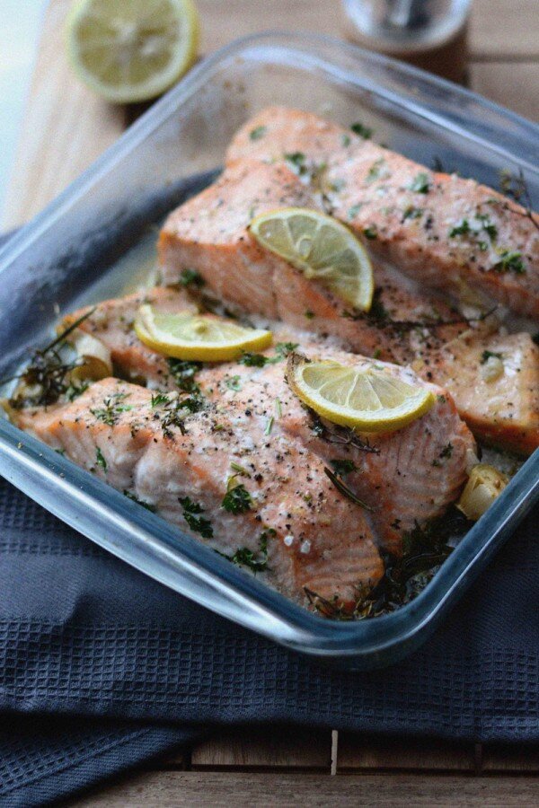 Запеченный ароматный лосось в духовке с травами и лимоном Вкусный рецепт Лосось является отличным источником белка, очень вкусным и часто предпочитаемым на кухне из-за его хорошего вкуса и того факта, что его можно очень легко приготовить. Жирная рыба также является одним из наиболее ценных источников полезных омега-3 жирных кислот , о которых часто забывают из-за плохого выбора, который делают многие из нас. Я представлю вам удобный и простой рецепт для приготовления запеченного лосося в духовке с очень низкой температурой в течение длительного времени с кастрюлей, наполненной водой для влажности. В результате у вас будут сочные и ароматные филе лосося. В этом рецепте есть три важных аспекта: низкая температура, влажность и свежие травы. Низкая температура защищает белок и ценные жиры в рыбе, которые имеют свойство изменять свой состав и «разрушать» при длительной и / или сильной термической обработке. Это также помогает уменьшить жир и «жирный вкус», который может быть отталкивающ